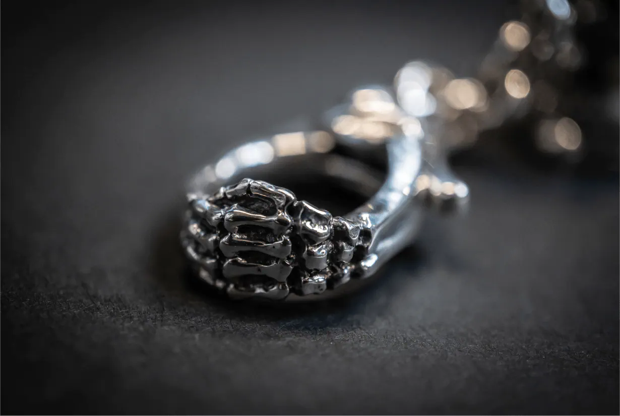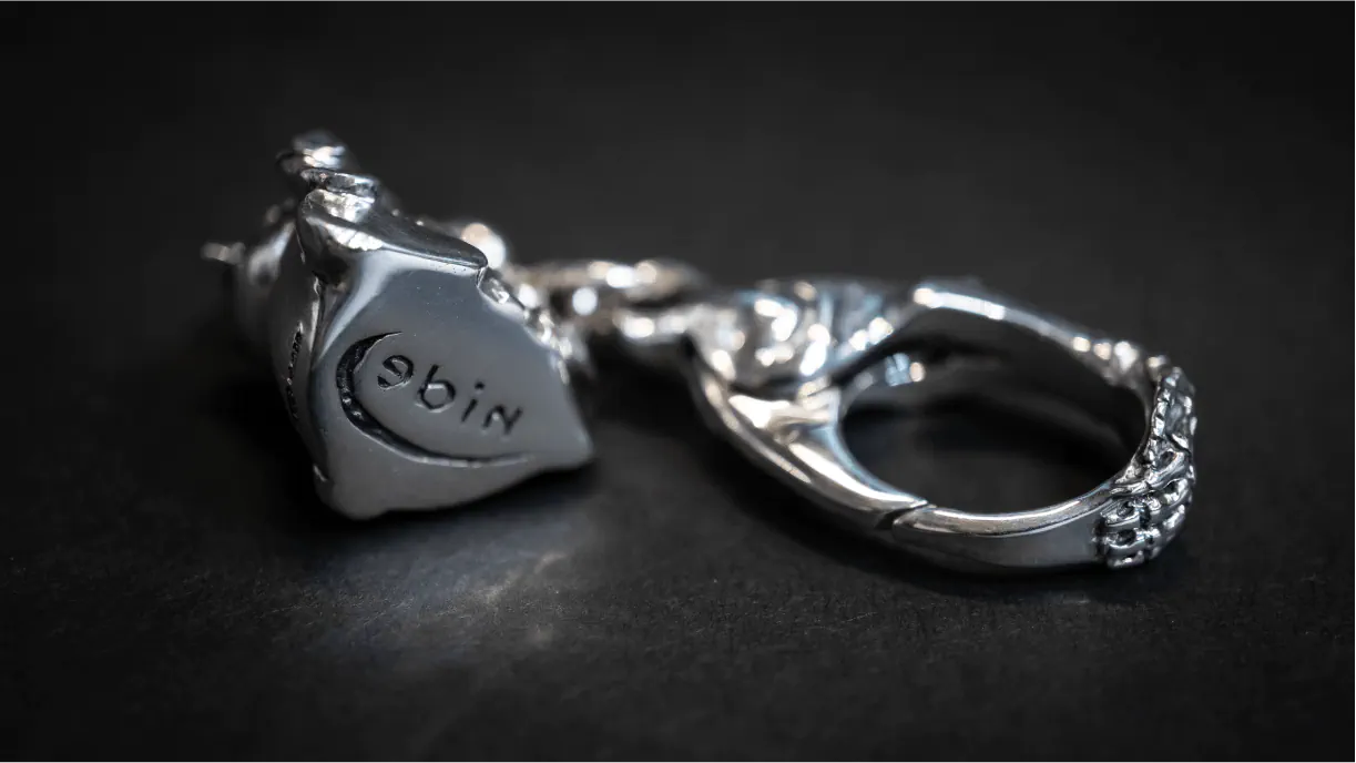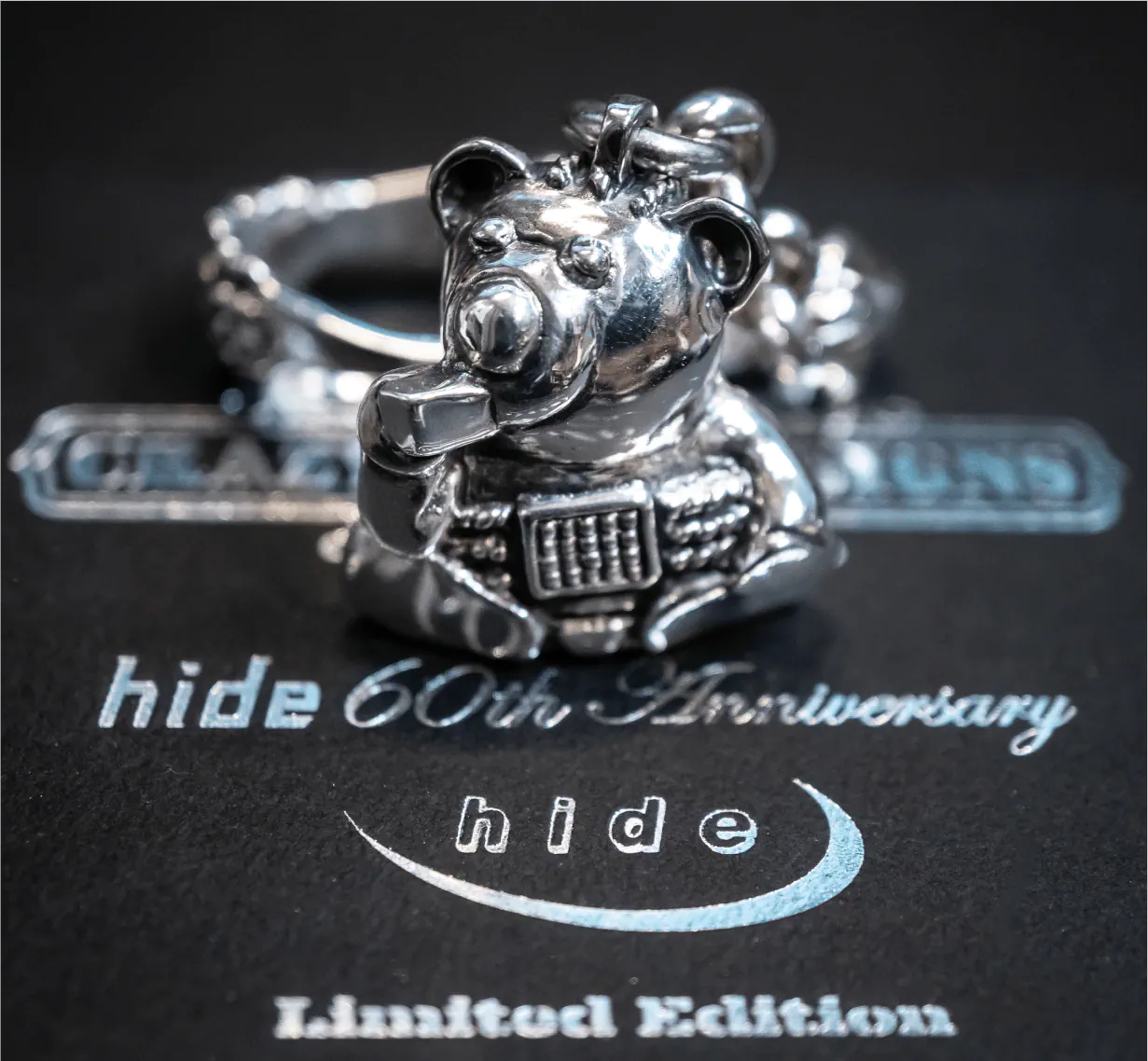 アーマンド・セラはこう語ります。「サイコベアを卓上に置くだけでなく、身近に連れ出せるようにカラビナをデザインしたよ。ジュエリーは身に着けることで生きるものだからね。そしてファンの皆さんにとってhideのジュエリーといえば『ボーンハンドリング』のイメージが深く印象に残るから、それをカラビナのデザインに取り込んだ。」