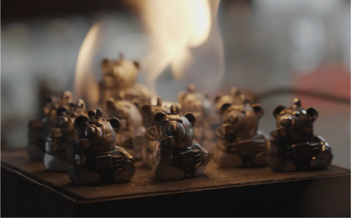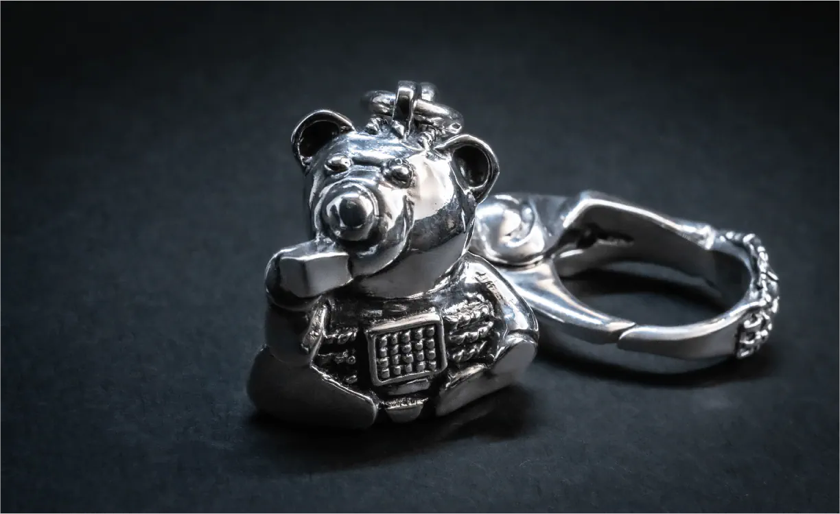 当初のコンセプトは、卓上に静かに鎮座するシルバー製のサイコベアの置物。愛らしいずんぐりとしたフォルムを忠実に再現するため、完全な立体造型によりシルバーならではの確かな重量感と緻密なディテールを実現、単なる置物を超えたジュエリーとしての本質を追求しました。