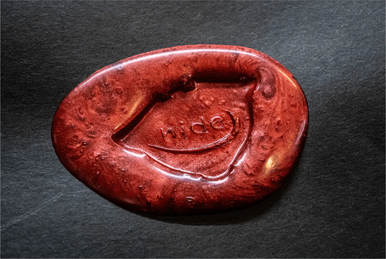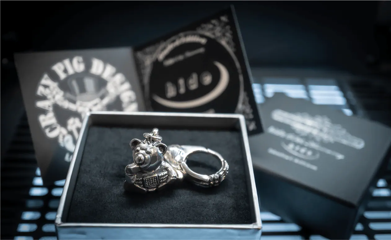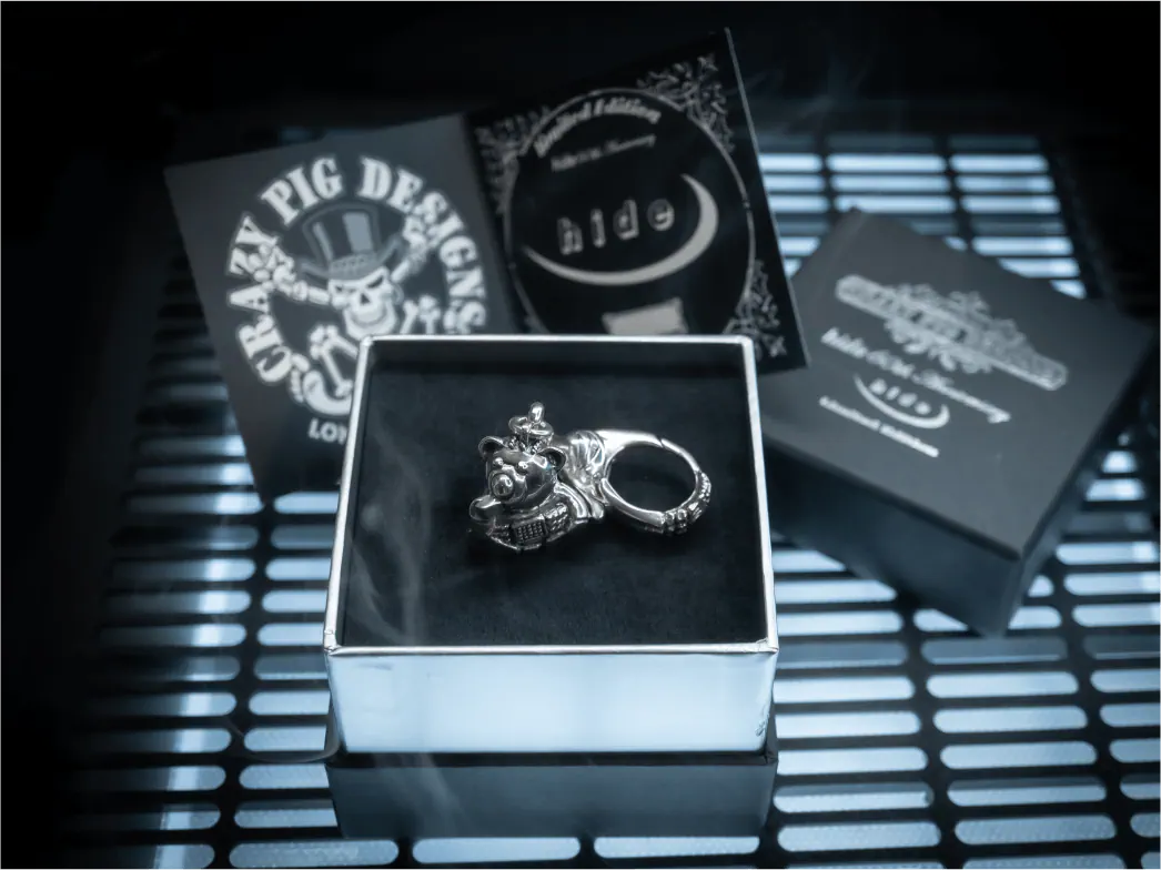 サイコベアの底面に反転彫刻されたhideのロゴは、シーリングスタンプとして機能するユニークなアイデアです。大切な人への手紙の蝋封に使用する(ワックスで封をしてスタンプする)など、hideのエッセンスを日常に取り入れることができるこの仕掛けは、多彩な発想で人々を魅了してきたhideの想像力とCRAZY PIG DESIGNSがジュエリーに新たな可能性を見出す姿勢を象徴しています。