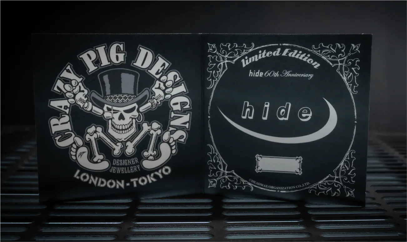 hideとCRAZY PIG DESIGNSのロゴ入り特製ジュエリーボックスとシリアル番号を記入した2つ折りカードが付属します。